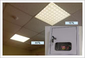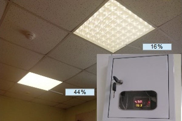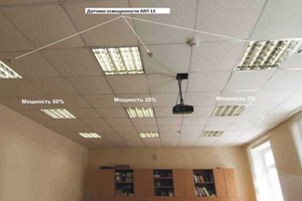В качестве диммируемых источников освещения могут использоваться модернизированные люминесцентные светильники 4×18 Вт. Модернизация состоит в замене стандартных дросселей и пускателей на управляемые электронные балласты (ЭПРА). Помимо возможности диммирования, данные ЭПРА снижают потребление на 35-45% и продлевают срок службы ламп в 3 раза, что значительно снижает общие затраты на эксплуатацию и утилизацию люминесцентных ламп. Учитывая большой парк таких светильников модернизация может быть альтернативой замене на светодиодные источники света. На Рис. 5 показана работа системы СУОО с люминесцентными светильниками в школьном классе. Расположенные у окон светильники работают в режиме минимальной мощности 5%, второй и третий ряды работают в режимах 20% и 60% от максимальной мощности, соответственно, что обеспечивает средний уровень экономии электроэнергии для данного помещения и данных условий 72%.